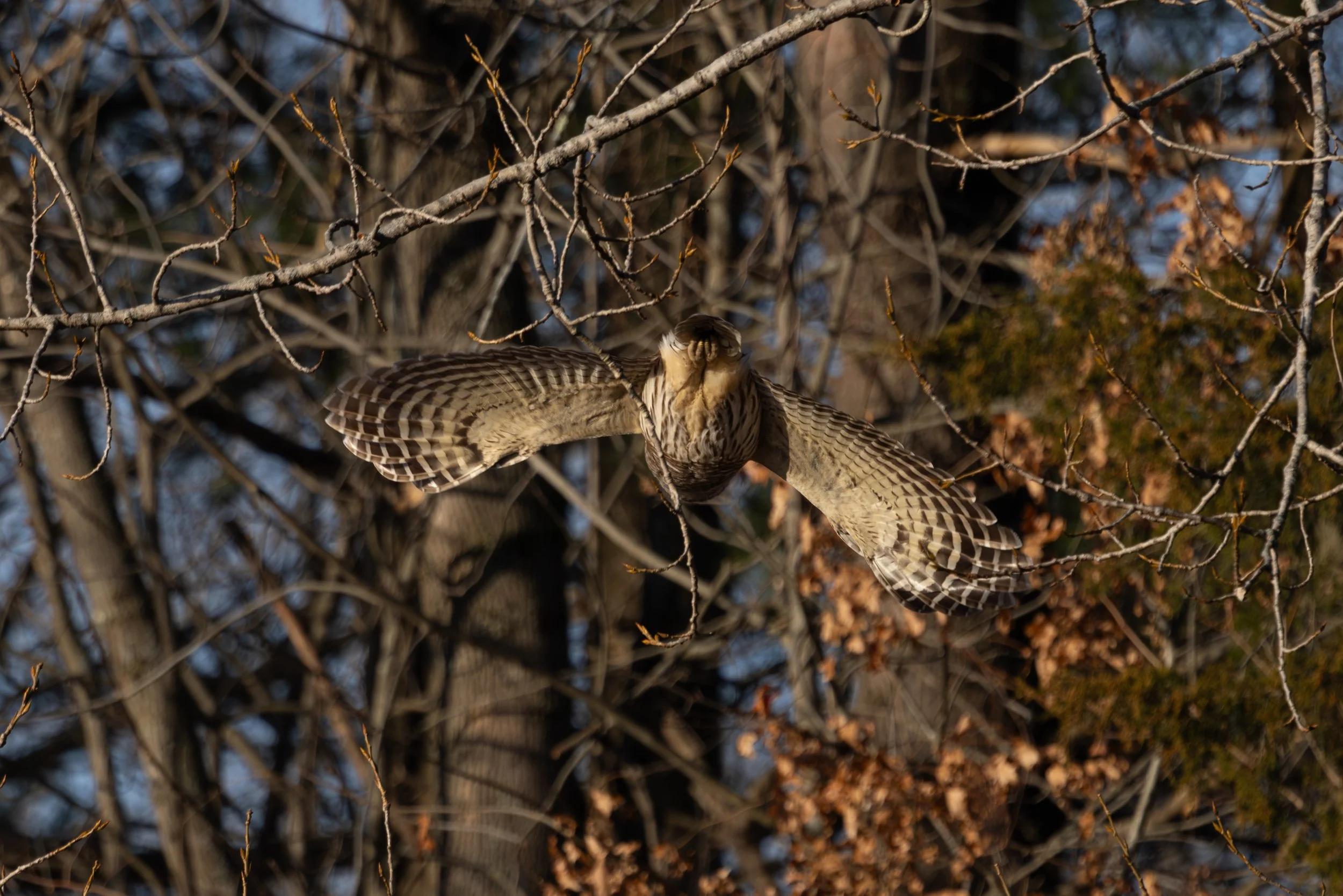 I decided to wait since it seemed like she kept coming back to the woods…. I waited and waited… Then all of a sudden I sensed some motion behind me - I turned just in time to see her flying very low and through the trees towards the backside of the wetland area where I had originally seen her when I first spotted her this morning.. I kept looking and looking to try and spot her…. and then I did in the middle of the brambles and branches! I will never forget what happened next. All of a sudden I heard a sound I have never heard before -almost like some type of a screech. And then the following all happened in less than 2 seconds! It was the best I could since I had no idea what was happening and I couldn’t anticipate anything so I just fired away! Wow!