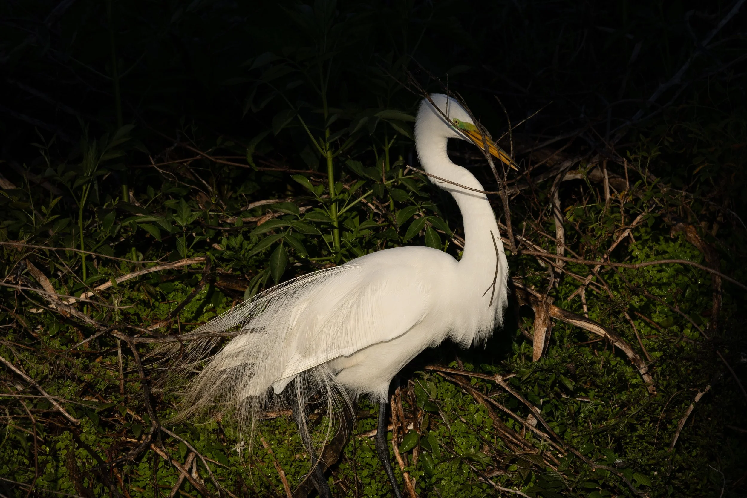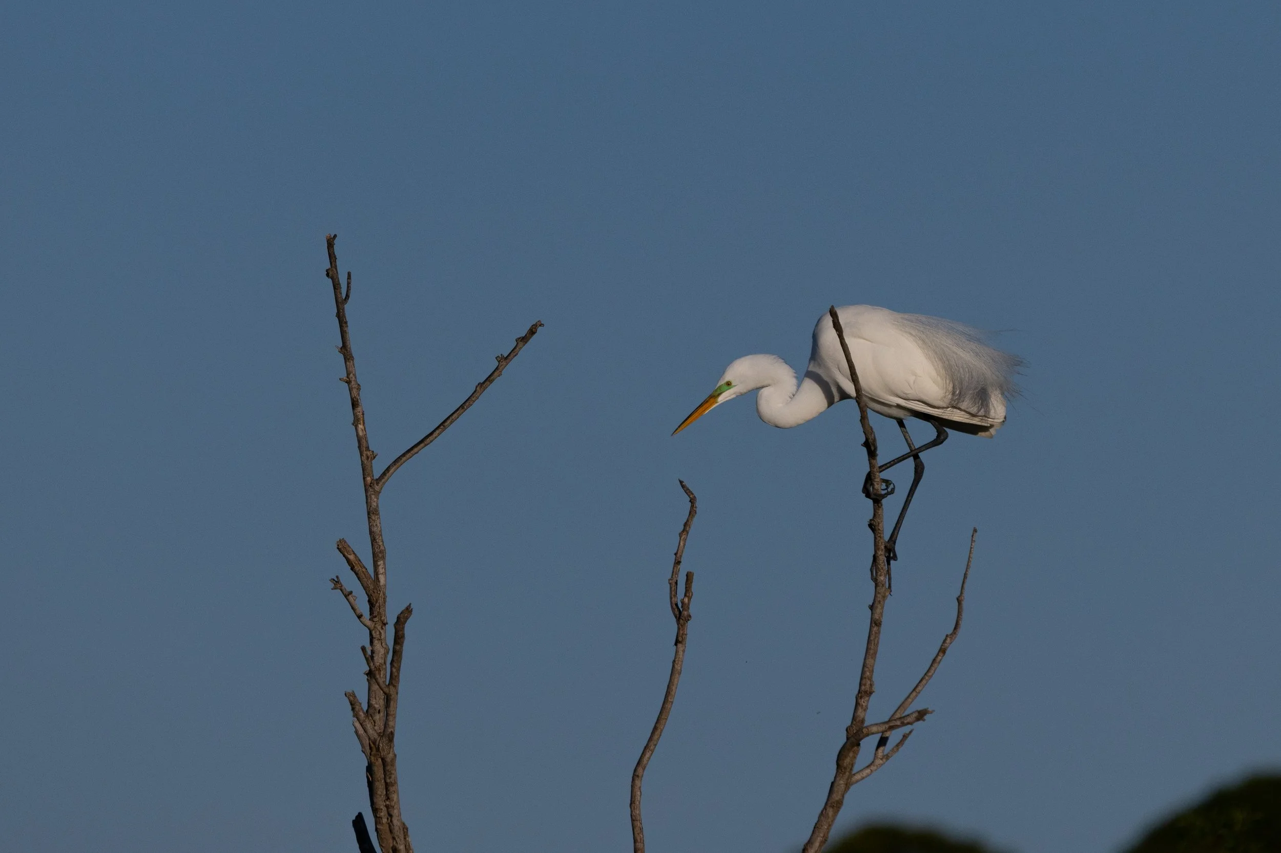 Beautiful White Egret Pair. During breeding season - according to Natureworks and Audubon they “develop spectacular, long, delicate plumes knows as aigrettes on their backs that drape over the tail. The facial skin (lores) turns a vibrant lime or neon green, and the base of the yellow bill may darken”.