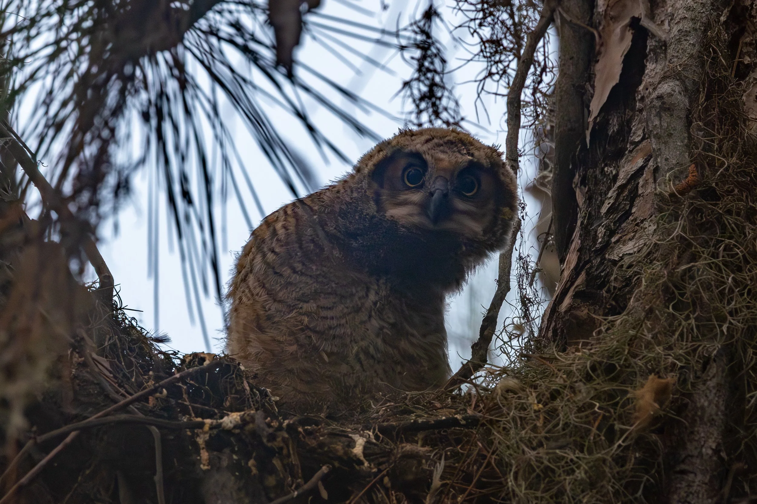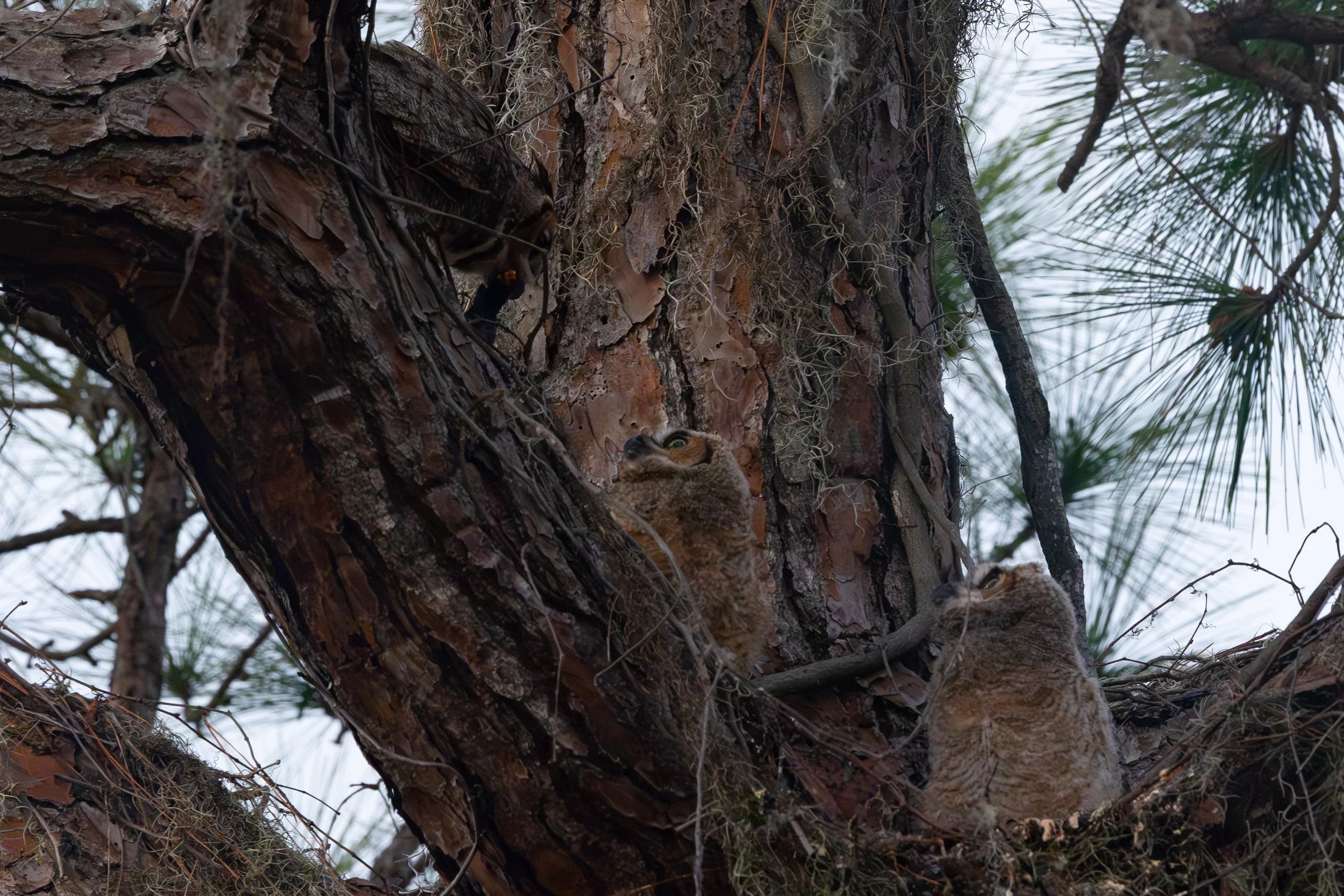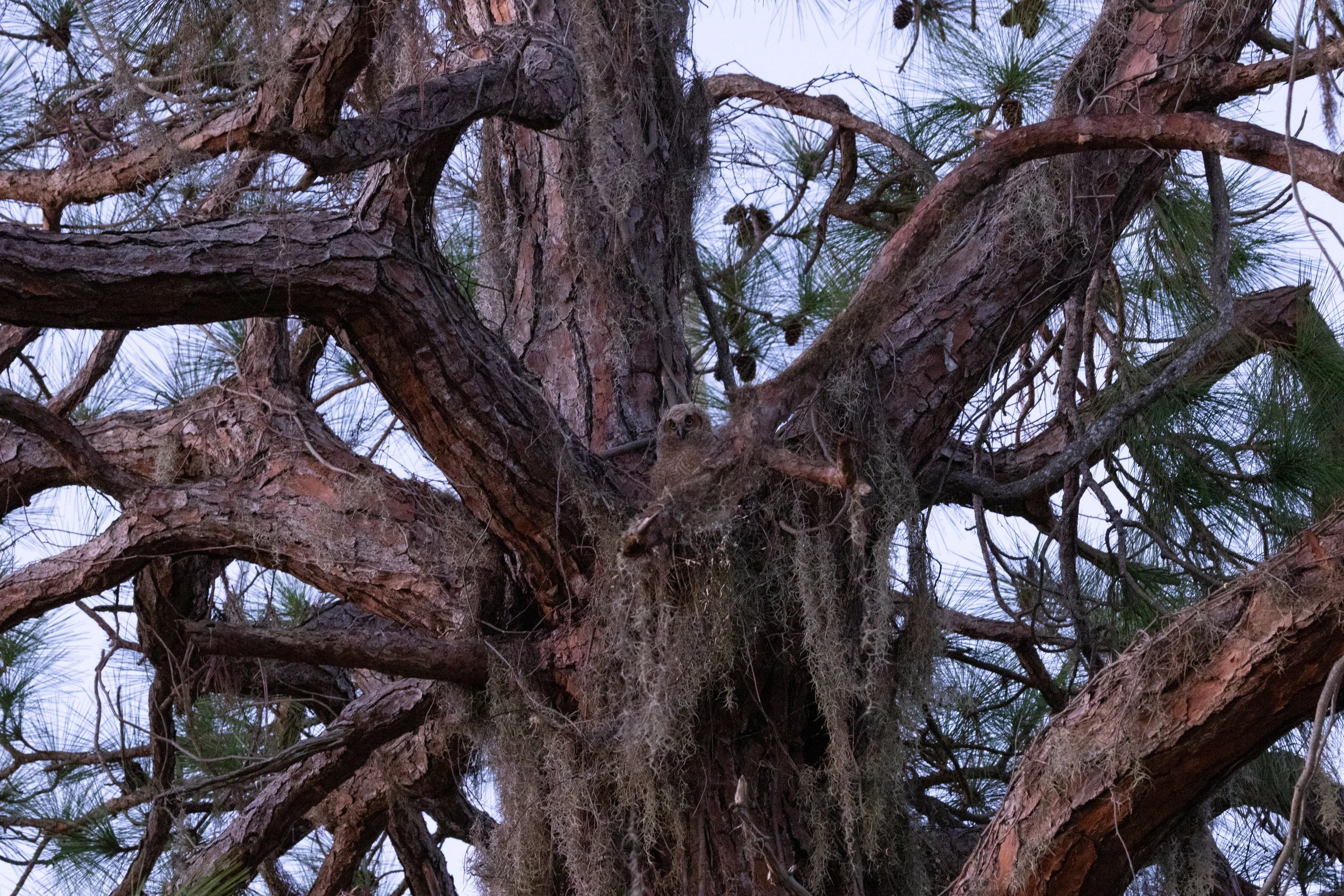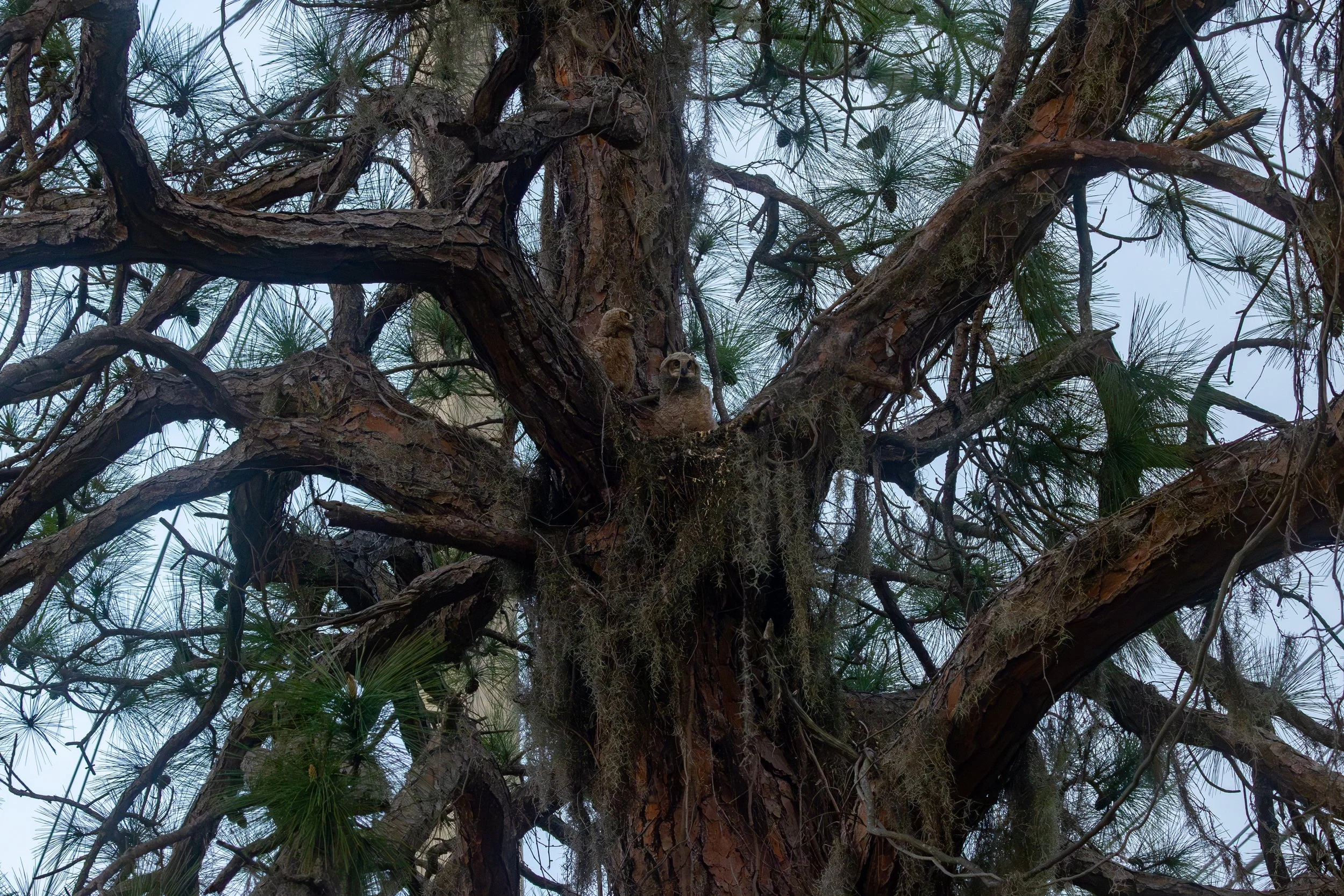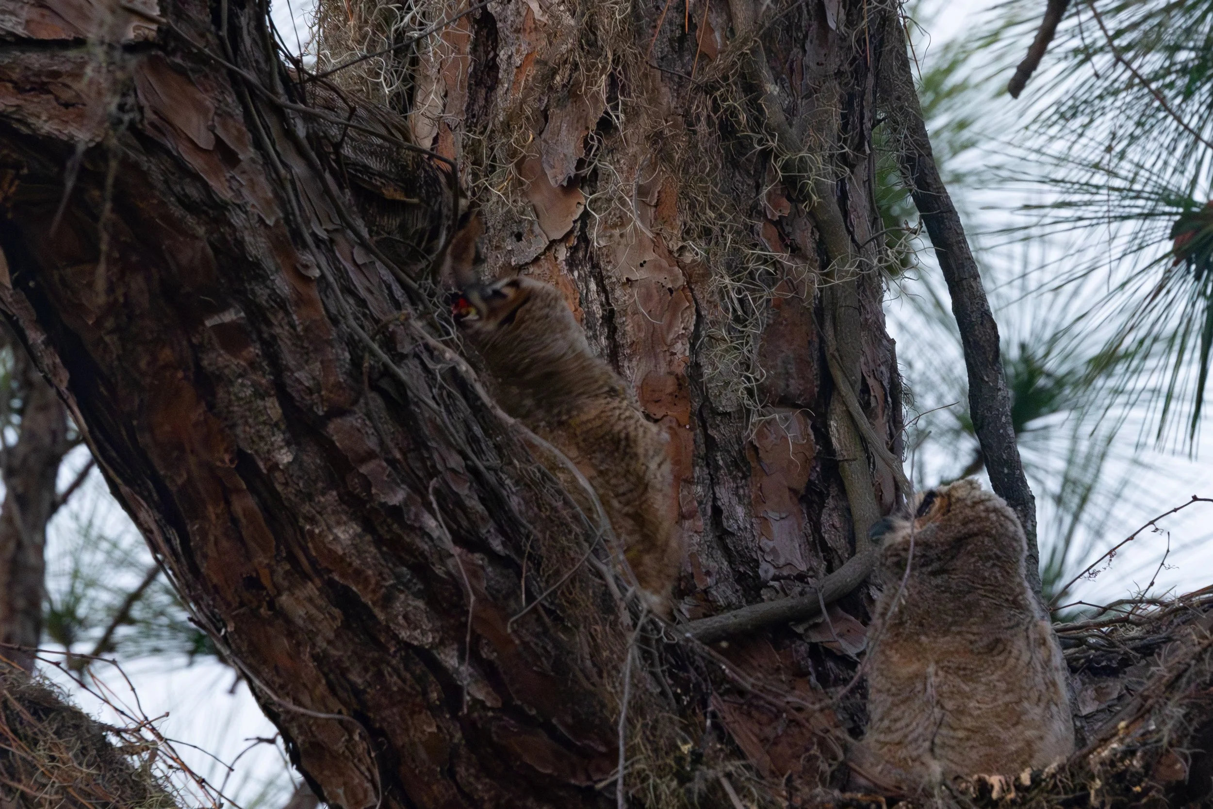 Another amazing adventure with sister-in-law Tami also involves Tami’s brother-in-law Bryle. While I was still in Florida visiting , Bryle let Tami and I know that he knew of where a Great Horned Owl nest was! I asked where it was and he said it was at Benderson Park. I had no idea where Benderson was or what kind of a park it was. Well, it was not around the corner but Tami said she was up for taking me and Bryle said he would meet us in order to show us the nesting site - you know how excited I was to have this opportunity. As usual we left very early - it was a very dark, foggy and cloudy morning. I think it took us about 40 minutes to get to the parking area that Bryle said to meet him at. About 2 minutes after we arrived Bryle pulled up coming from the other direction - perfect timing. Benderson Park is not a wildlife park - it is a recreational park with a huge 400 acre lake surrounded by a walking/biking trail. The handful of people who were there when we arrived were biking or walking with headlamps on - it was very dark. Anyway, I kept thinking… where the heck are going to walk to find the owls. As soon as I had my gear out of the car Bryle walked over to us. After we all said good morning to each other I said where are we heading to??? He didn’t say a word but instead turned slightly to his right and pointed way up into a tree that we were parked across from! I said - you have got to be kidding me! He said - the hooters are up there! I said - No way! He said - yes!! Tami and I could not believe it- how could this be???