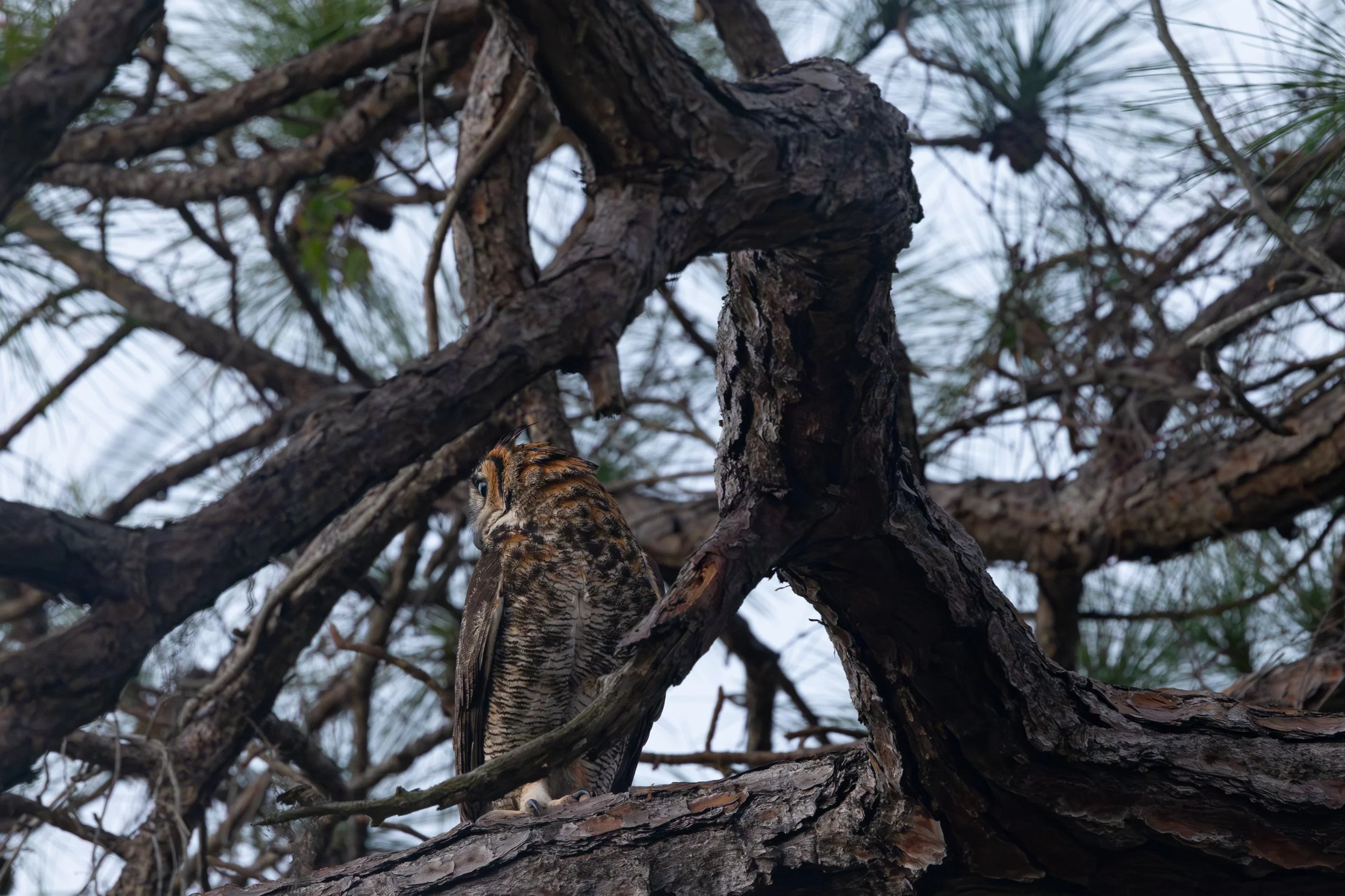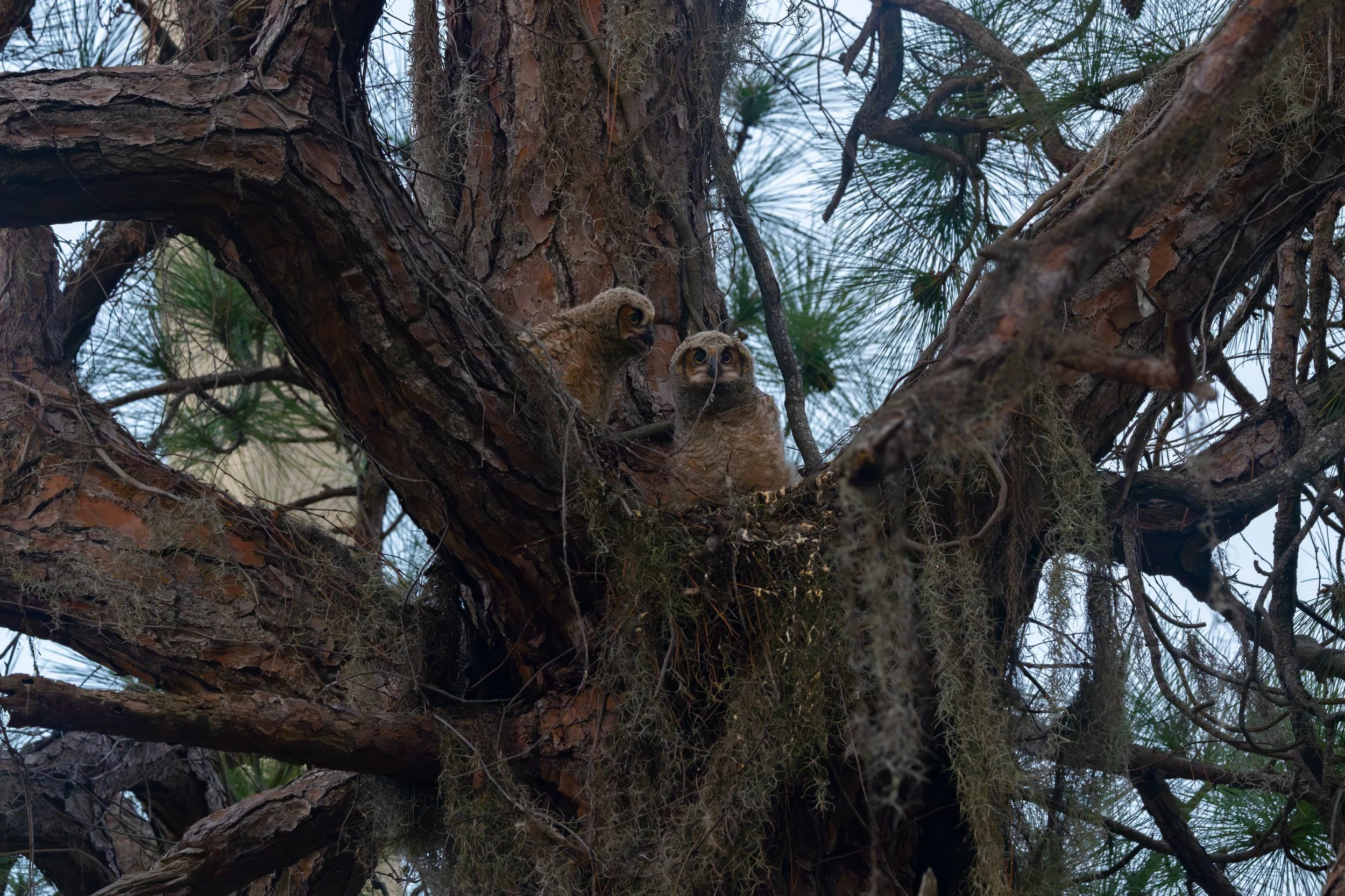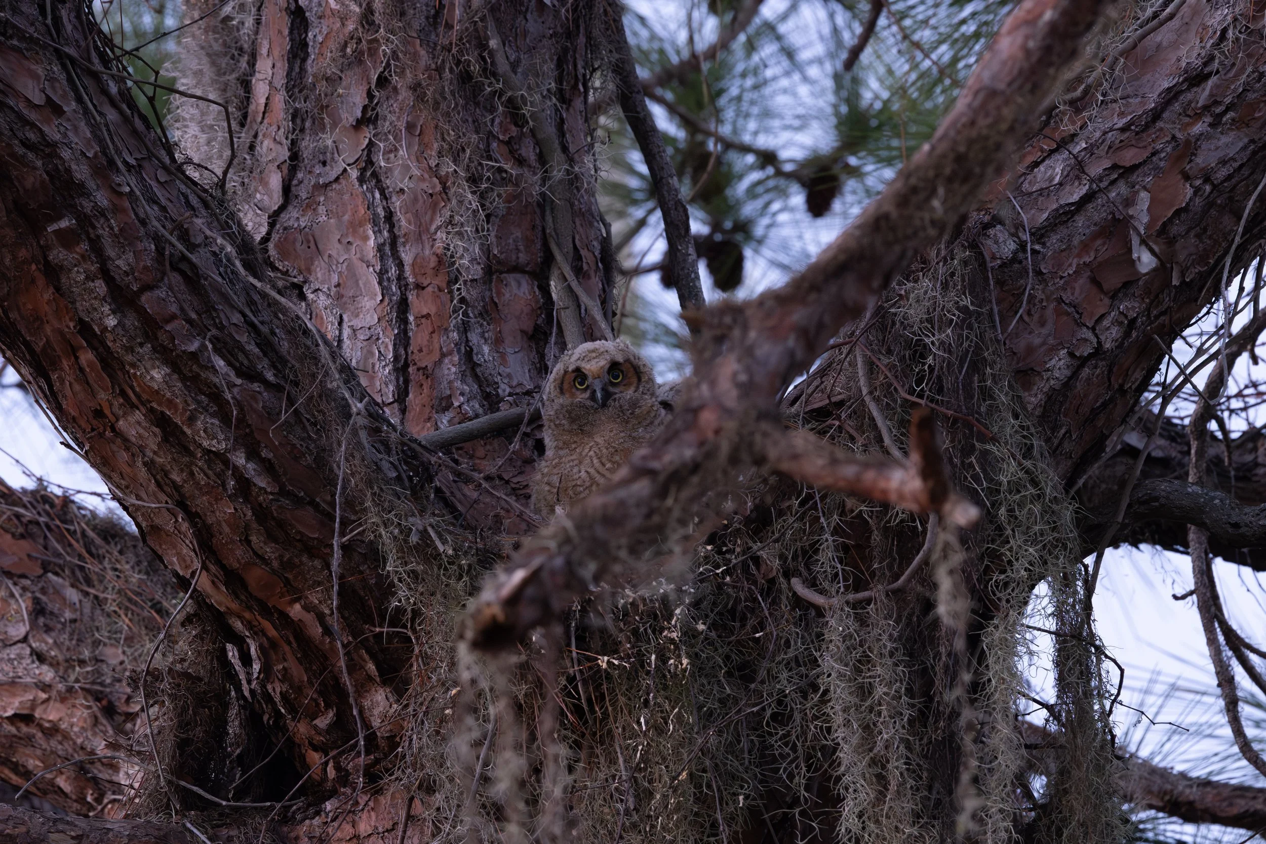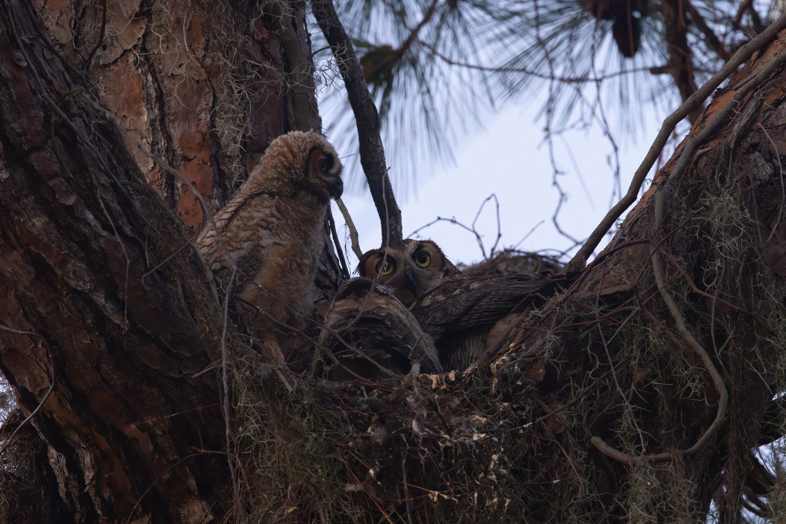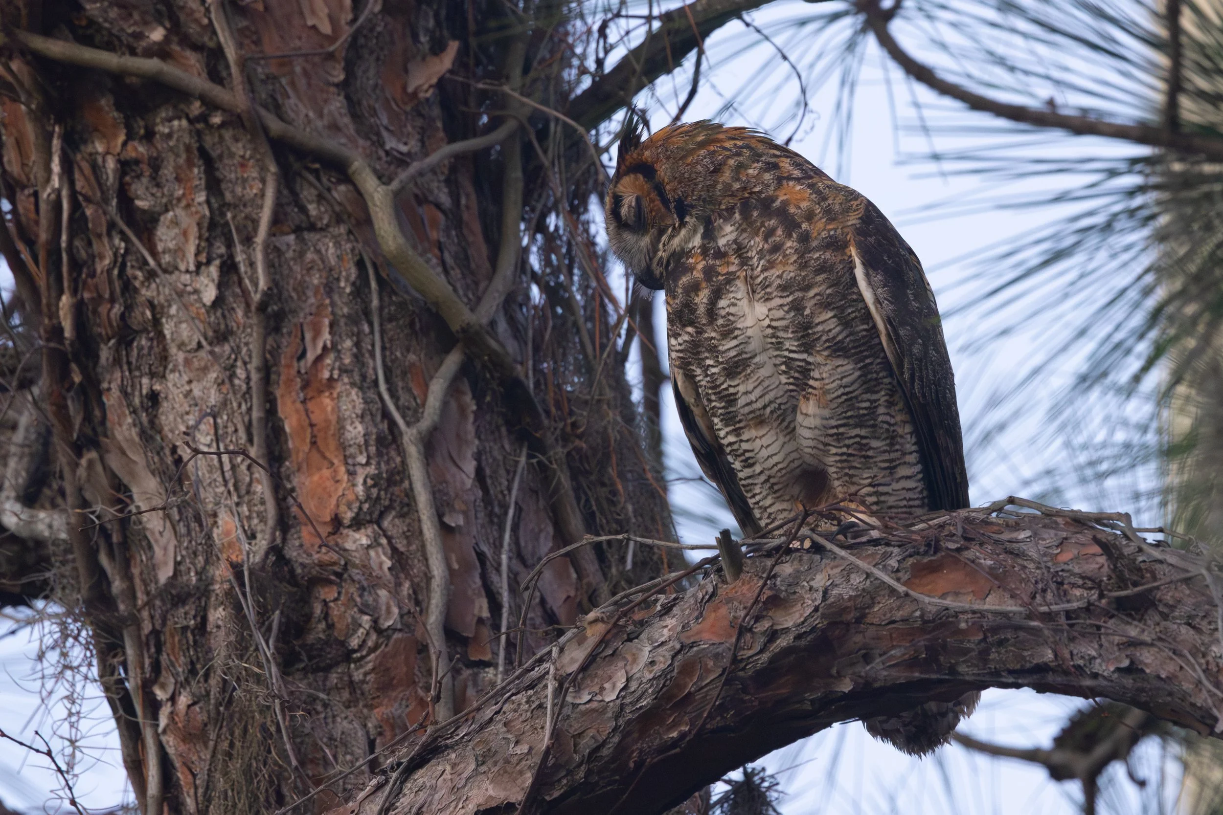 Another amazing adventure with sister-in-law Tami also involves Tami’s brother-in-law Bryle. While I was still in Florida visiting , Bryle let Tami and I know that he knew of where a Great Horned Owl nest was! I asked where it was and he said it was at Benderson Park. I had no idea where Benderson was or what kind of a park it was. Well, it was not around the corner but Tami said she was up for taking me and Bryle said he would meet us in order to show us the nesting site - you know how excited I was to have this opportunity. As usual we left very early - it was a very dark, foggy and cloudy morning. I think it took us about 40 minutes to get to the parking area that Bryle said to meet him at. About 2 minutes after we arrived Bryle pulled up coming from the other direction - perfect timing. Benderson Park is not a wildlife park - it is a recreational park with a huge 400 acre lake surrounded by a walking/biking trail. The handful of people who were there when we arrived were biking or walking with headlamps on - it was very dark. Anyway, I kept thinking… where the heck are going to walk to find the owls. As soon as I had my gear out of the car Bryle walked over to us. After we all said good morning to each other I said where are we heading to??? He didn’t say a word but instead turned slightly to his right and pointed way up into a tree that we were parked across from! I said - you have got to be kidding me! He said - the hooters are up there! I said - No way! He said - yes!! Tami and I could not believe it- how could this be???