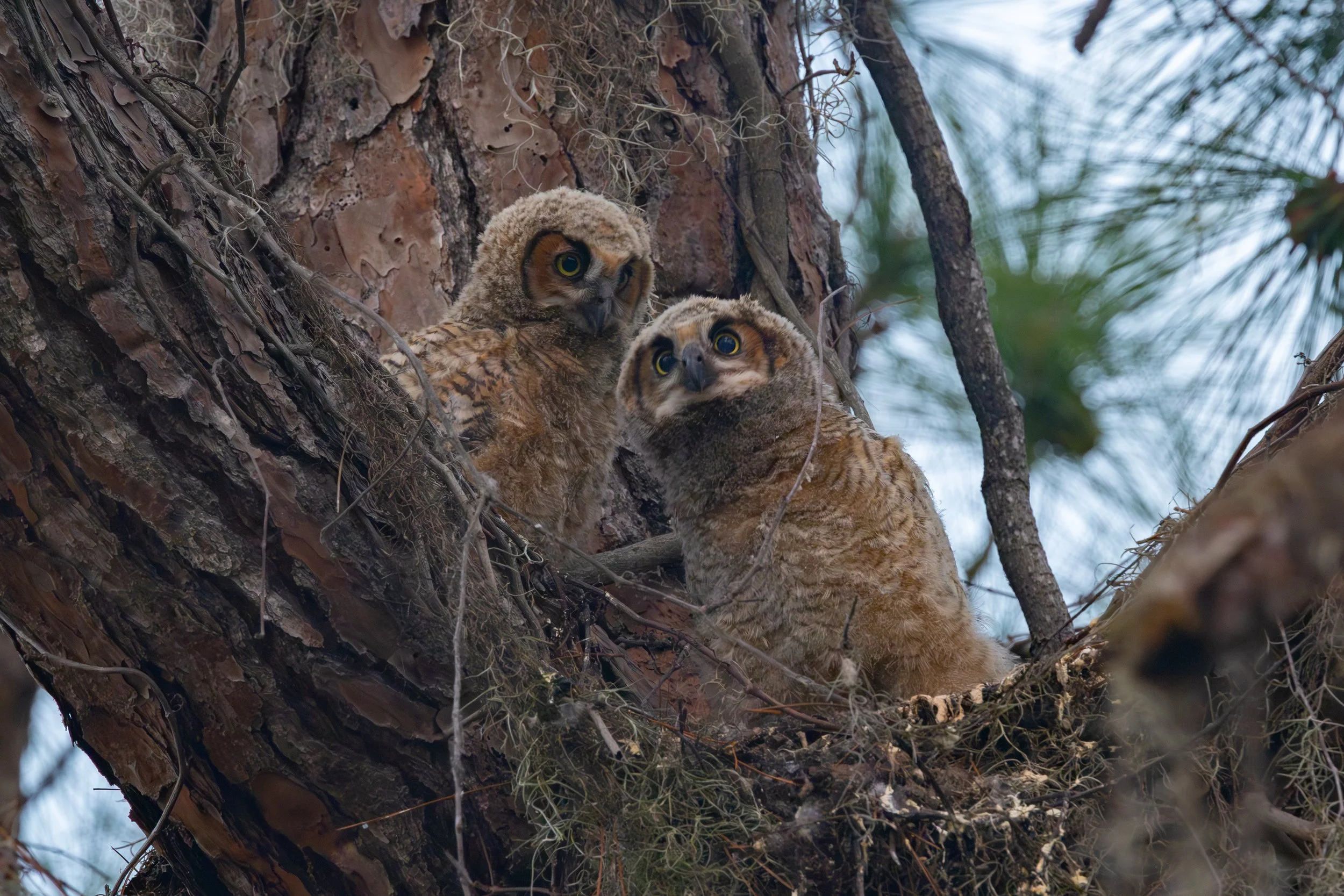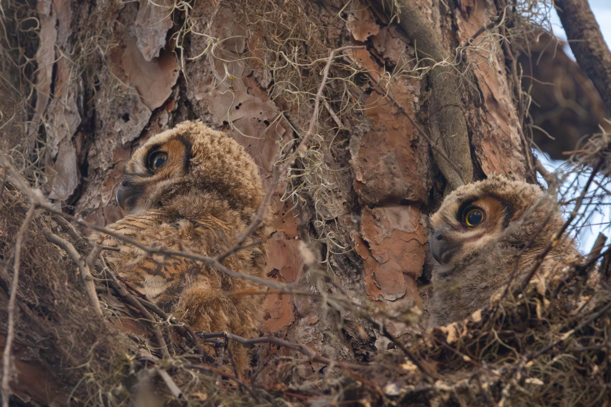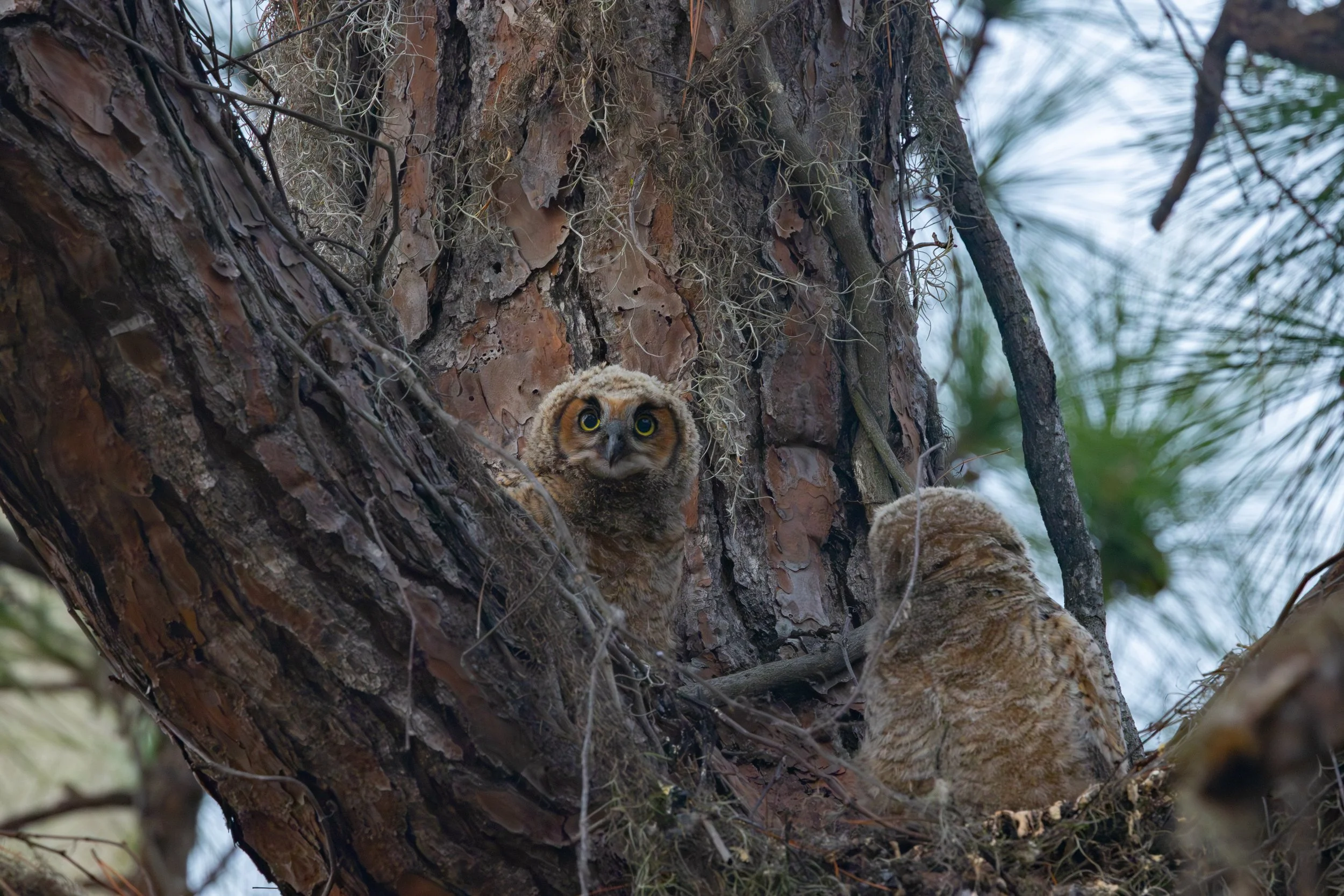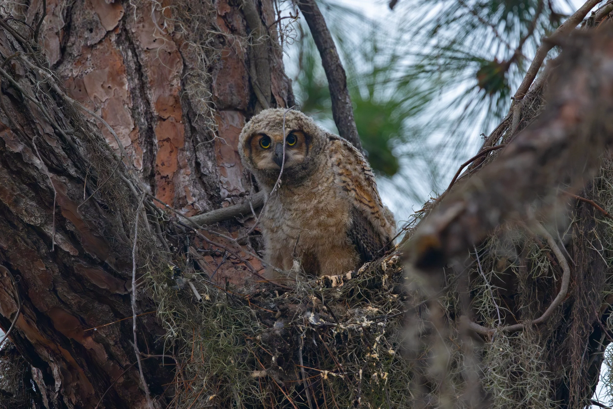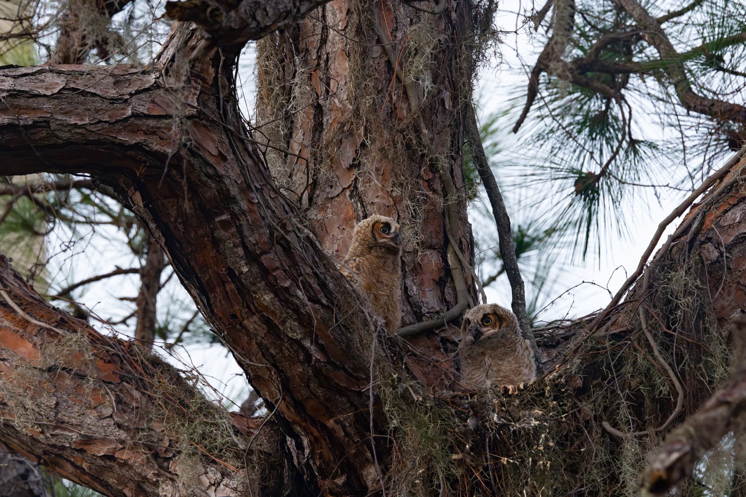 Another amazing adventure with sister-in-law Tami also involves Tami’s brother-in-law Bryle. While I was still in Florida visiting , Bryle let Tami and I know that he knew of where a Great Horned Owl nest was! I asked where it was and he said it was at Benderson Park. I had no idea where Benderson was or what kind of a park it was. Well, it was not around the corner but Tami said she was up for taking me and Bryle said he would meet us in order to show us the nesting site - you know how excited I was to have this opportunity. As usual we left very early - it was a very dark, foggy and cloudy morning. I think it took us about 40 minutes to get to the parking area that Bryle said to meet him at. About 2 minutes after we arrived Bryle pulled up coming from the other direction - perfect timing. Benderson Park is not a wildlife park - it is a recreational park with a huge 400 acre lake surrounded by a walking/biking trail. The handful of people who were there when we arrived were biking or walking with headlamps on - it was very dark. Anyway, I kept thinking… where the heck are going to walk to find the owls. As soon as I had my gear out of the car Bryle walked over to us. After we all said good morning to each other I said where are we heading to??? He didn’t say a word but instead turned slightly to his right and pointed way up into a tree that we were parked across from! I said - you have got to be kidding me! He said - the hooters are up there! I said - No way! He said - yes!! Tami and I could not believe it- how could this be???