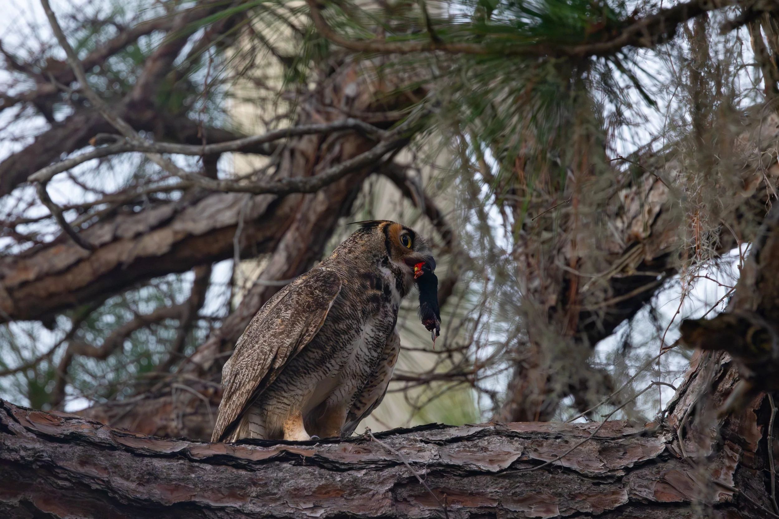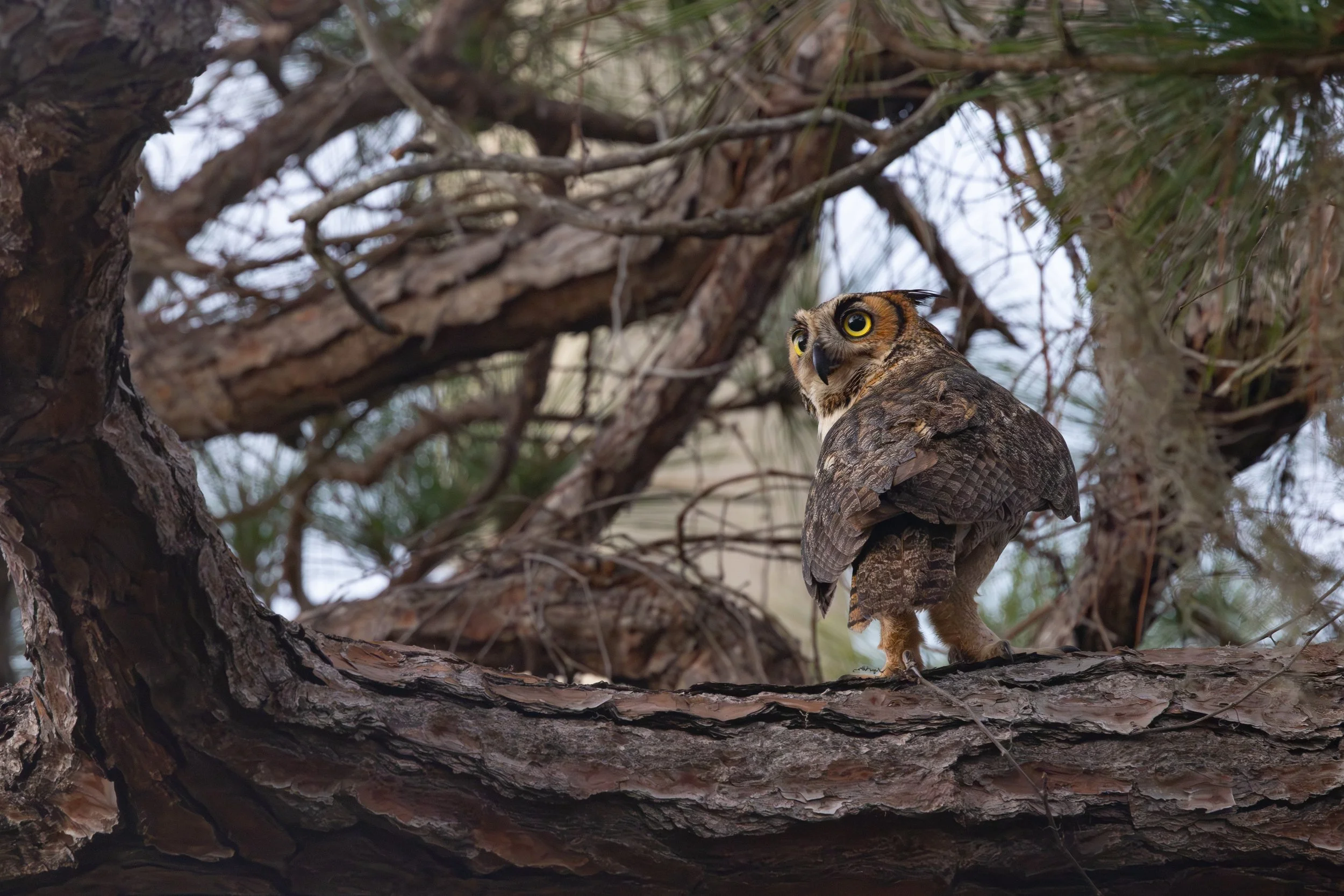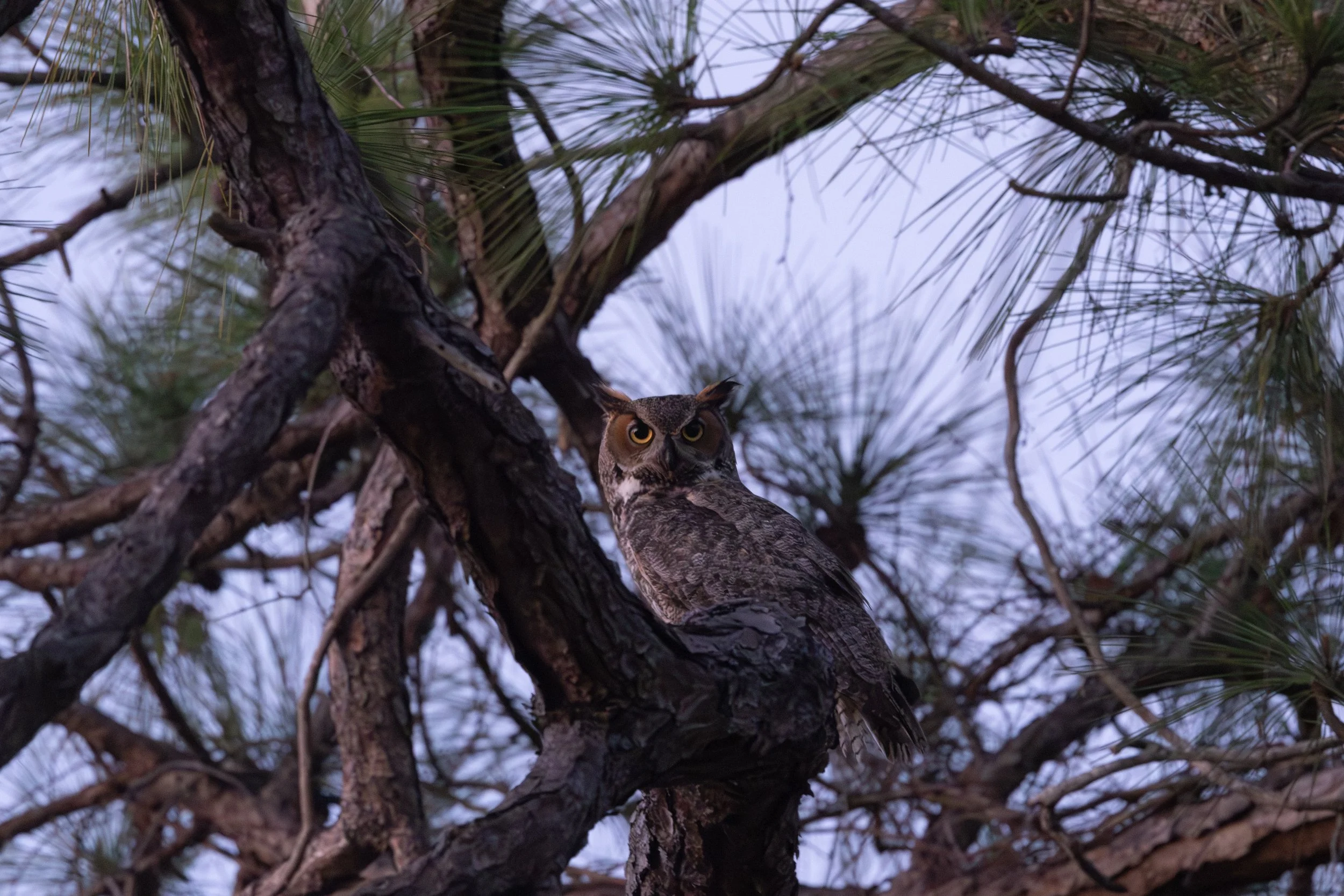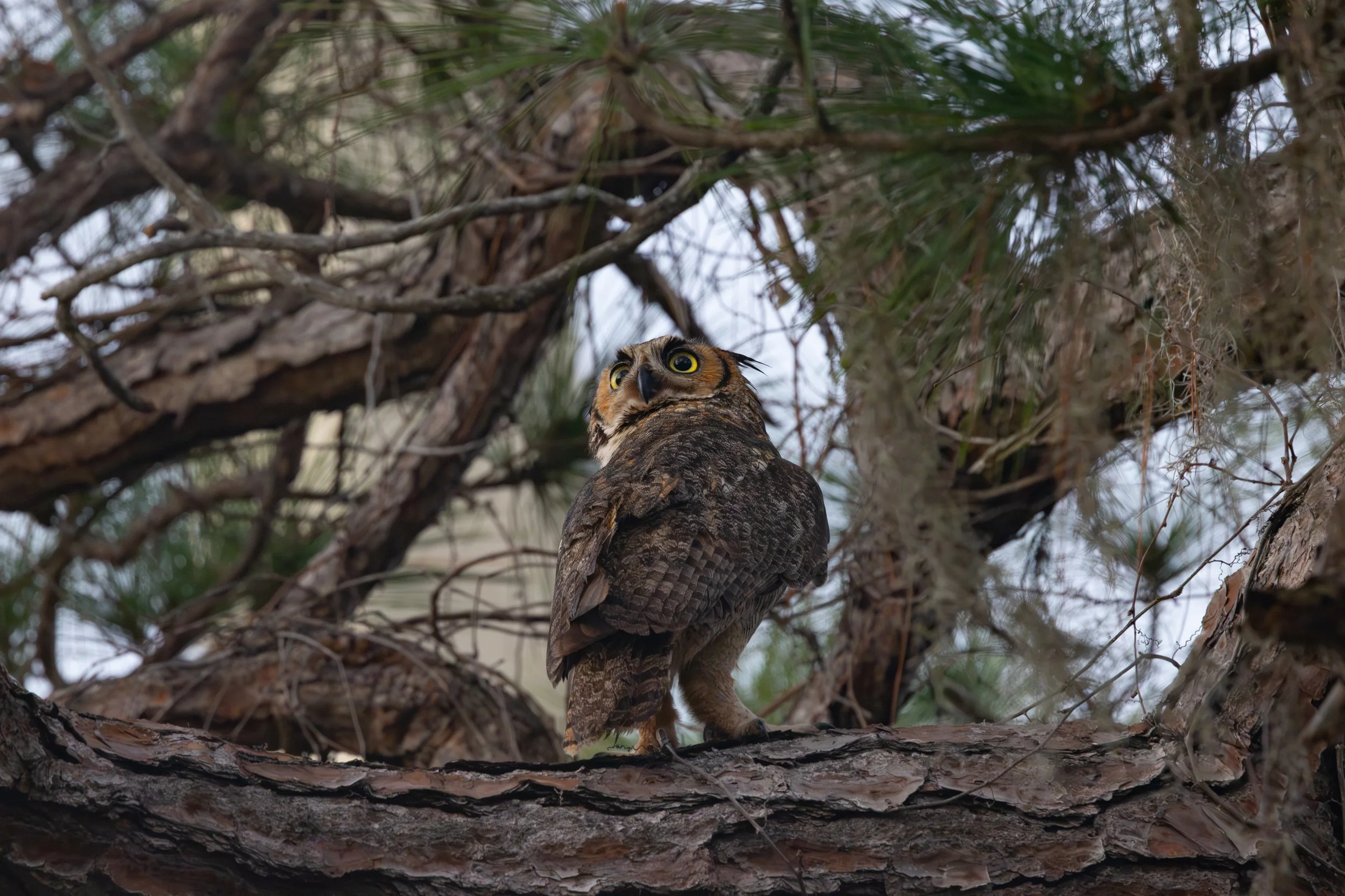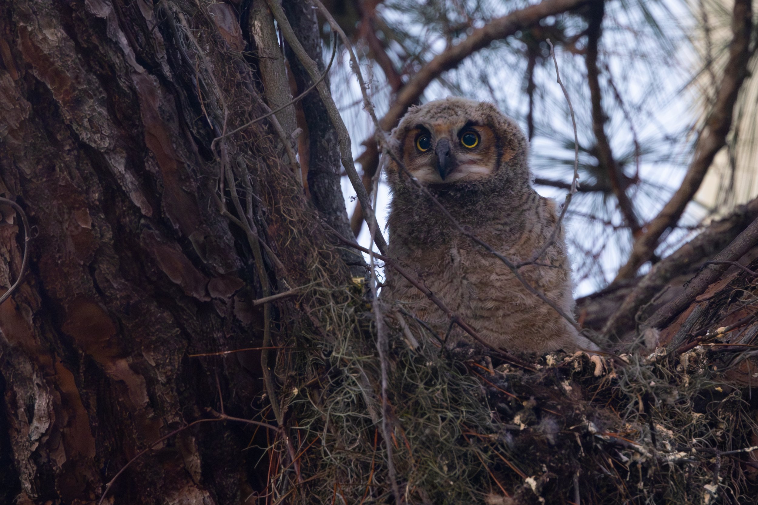 Another amazing adventure with sister-in-law Tami also involves Tami’s brother-in-law Bryle. While I was still in Florida visiting , Bryle let Tami and I know that he knew of where a Great Horned Owl nest was! I asked where it was and he said it was at Benderson Park. I had no idea where Benderson was or what kind of a park it was. Well, it was not around the corner but Tami said she was up for taking me and Bryle said he would meet us in order to show us the nesting site - you know how excited I was to have this opportunity. As usual we left very early - it was a very dark, foggy and cloudy morning. I think it took us about 40 minutes to get to the parking area that Bryle said to meet him at. About 2 minutes after we arrived Bryle pulled up coming from the other direction - perfect timing. Benderson Park is not a wildlife park - it is a recreational park with a huge 400 acre lake surrounded by a walking/biking trail. The handful of people who were there when we arrived were biking or walking with headlamps on - it was very dark. Anyway, I kept thinking… where the heck are going to walk to find the owls. As soon as I had my gear out of the car Bryle walked over to us. After we all said good morning to each other I said where are we heading to??? He didn’t say a word but instead turned slightly to his right and pointed way up into a tree that we were parked across from! I said - you have got to be kidding me! He said - the hooters are up there! I said - No way! He said - yes!! Tami and I could not believe it- how could this be???