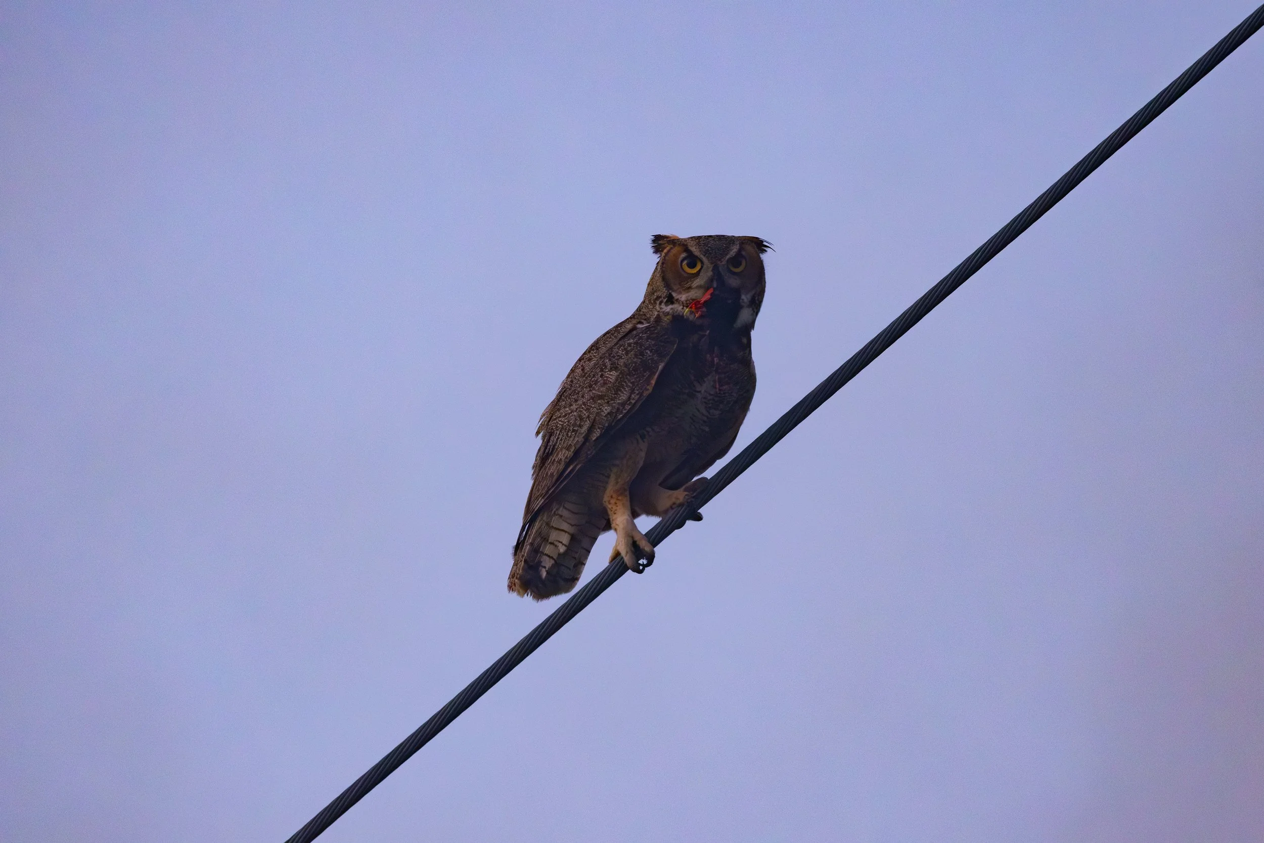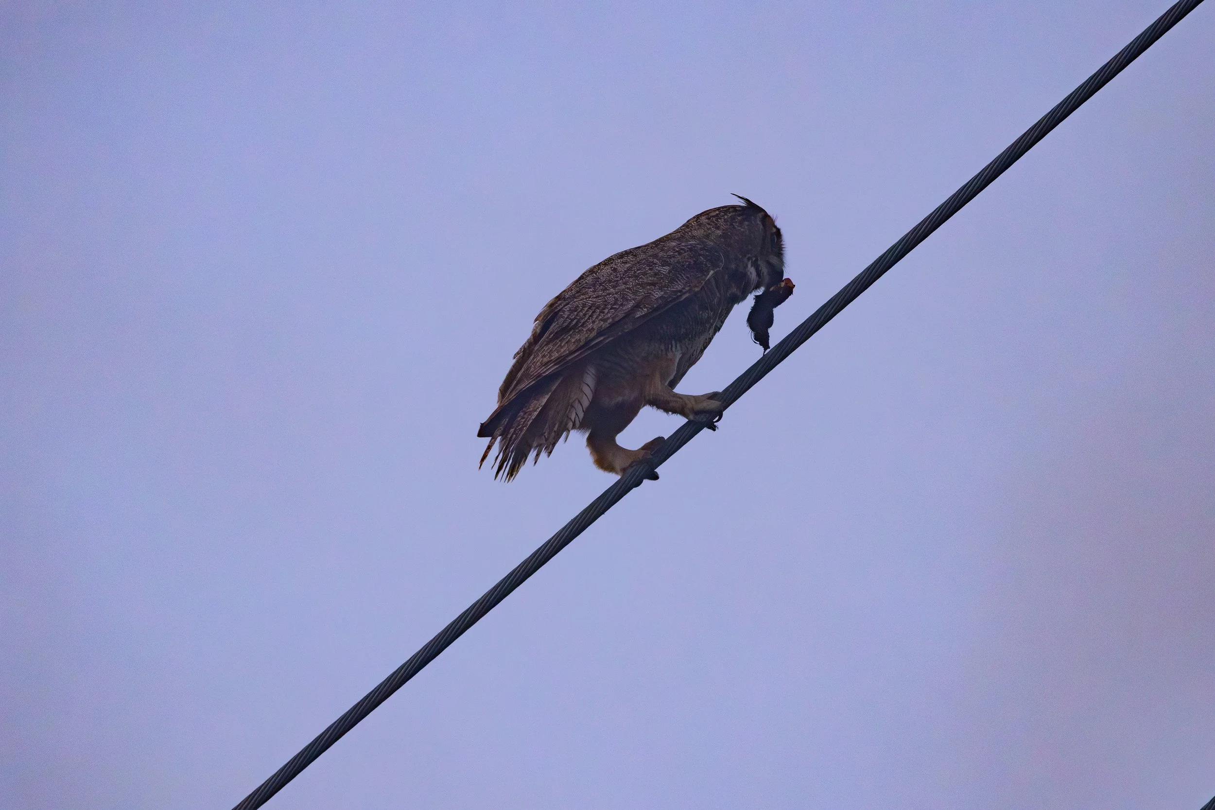 A few moments later a flash of movement to my left caught my eye! I couldn’t keep up with it in flight but the parent that had been resting clearly had taken flight to go find breakfast - and was successful! This high tension wire was to the left of the nest as there was a huge high tension pole behind the tree with the nest. The sky was still very cloudy so I just kept doing the best I could while trying to watch the nest and this parent -